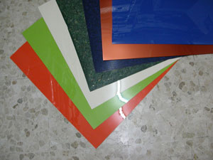 Chapas en material sintético para trabajos artesanales. Se cortan con segueta y se pulen por inmersión en acetona. Se venden en tamaño folio o piezas grandes de 70x70cm.